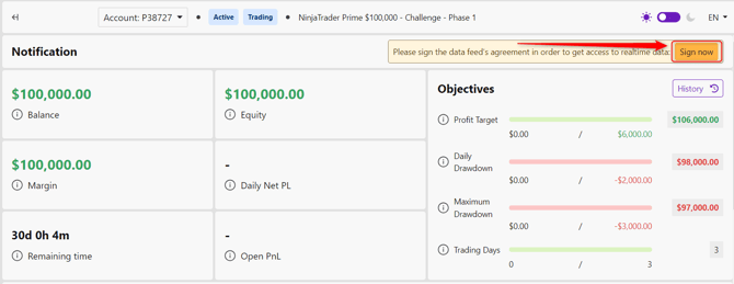 右上に、データフィード契約への署名を促す通知が表示されます。「今すぐ署名」ボタンをクリックして、Tradovateに進みます。