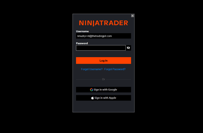 NinjaTraderプラットフォームを開き、The Trading Pit から送信されたユーザー名とパスワードを入力します。